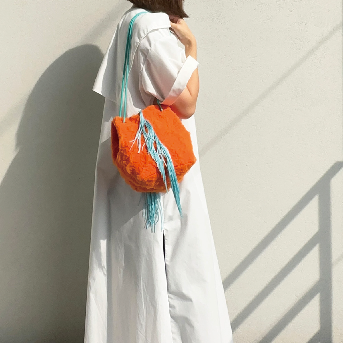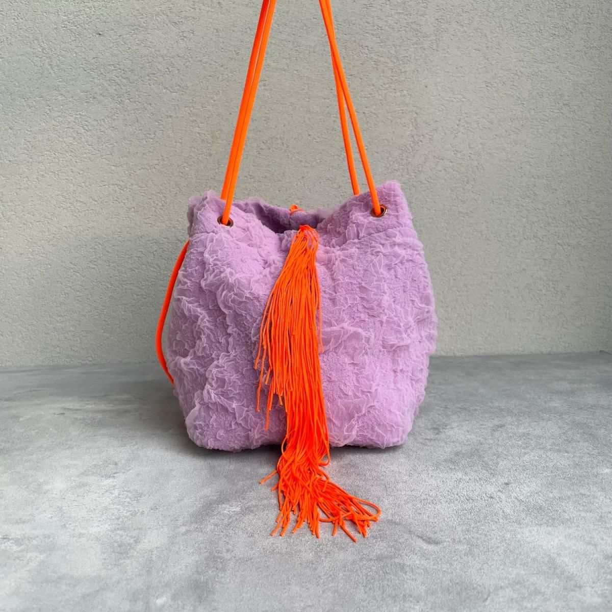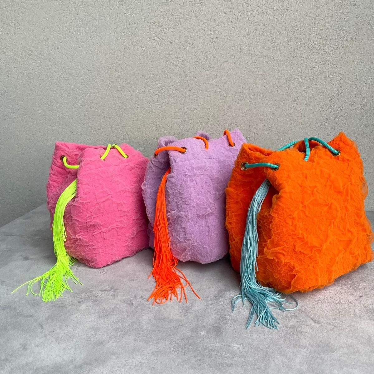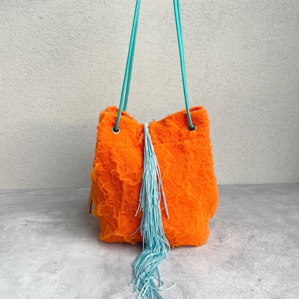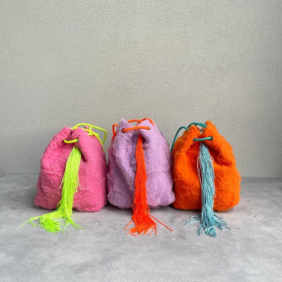 くしゅくしゅの生地とフリンジを組み合わせたミニバッグ。