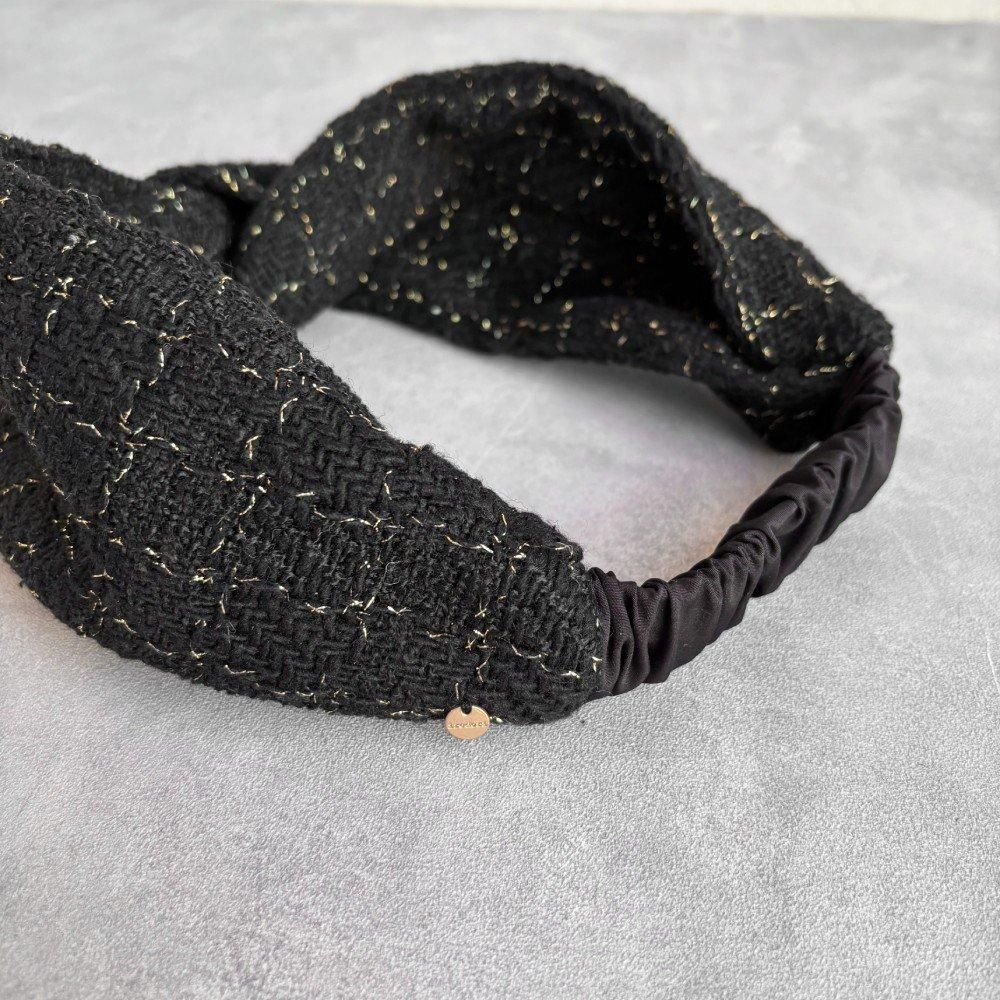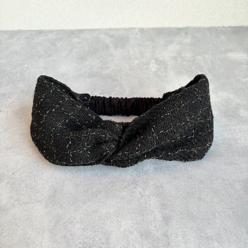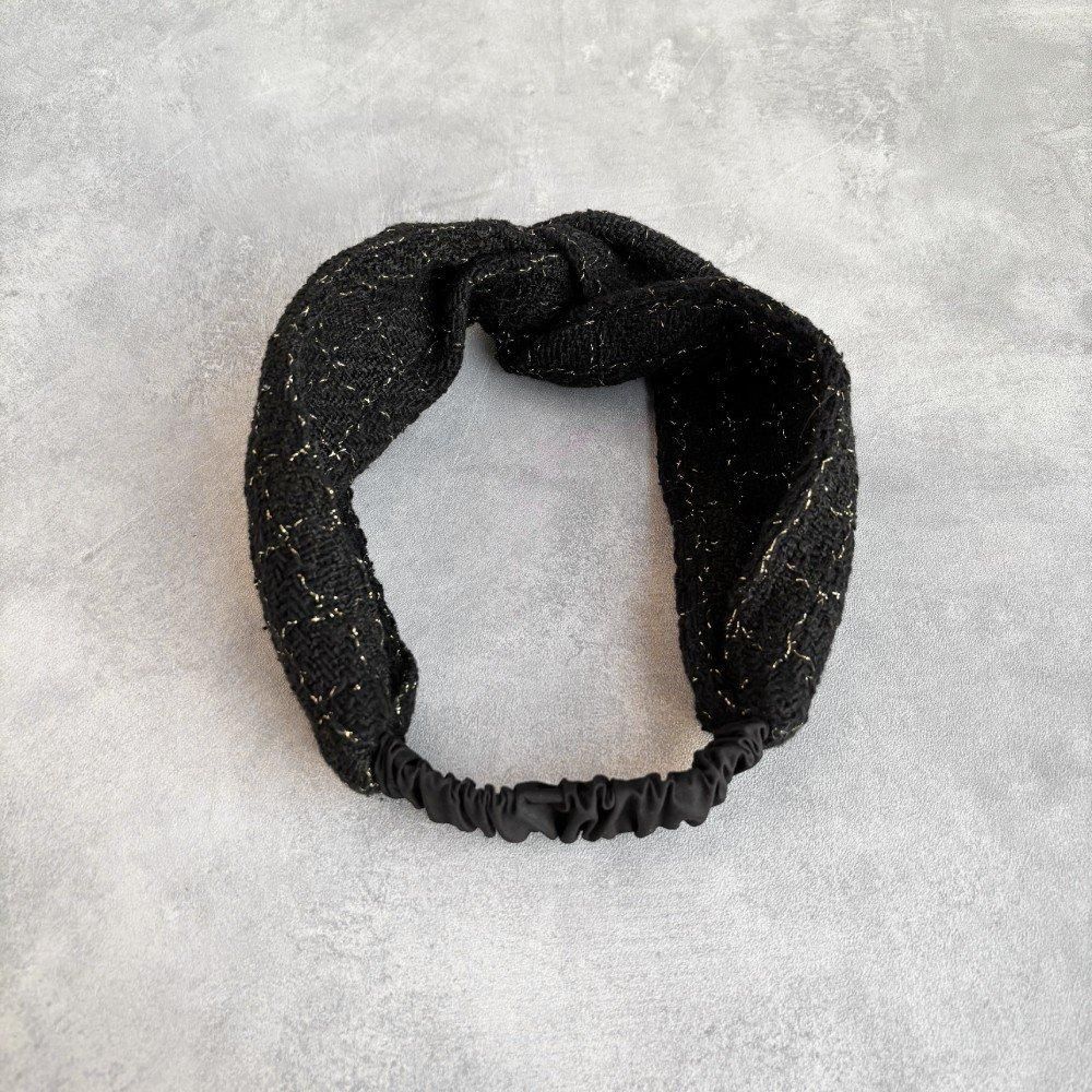 ブラックのツイード生地にゴールドの模様が入ったヘアターバン。