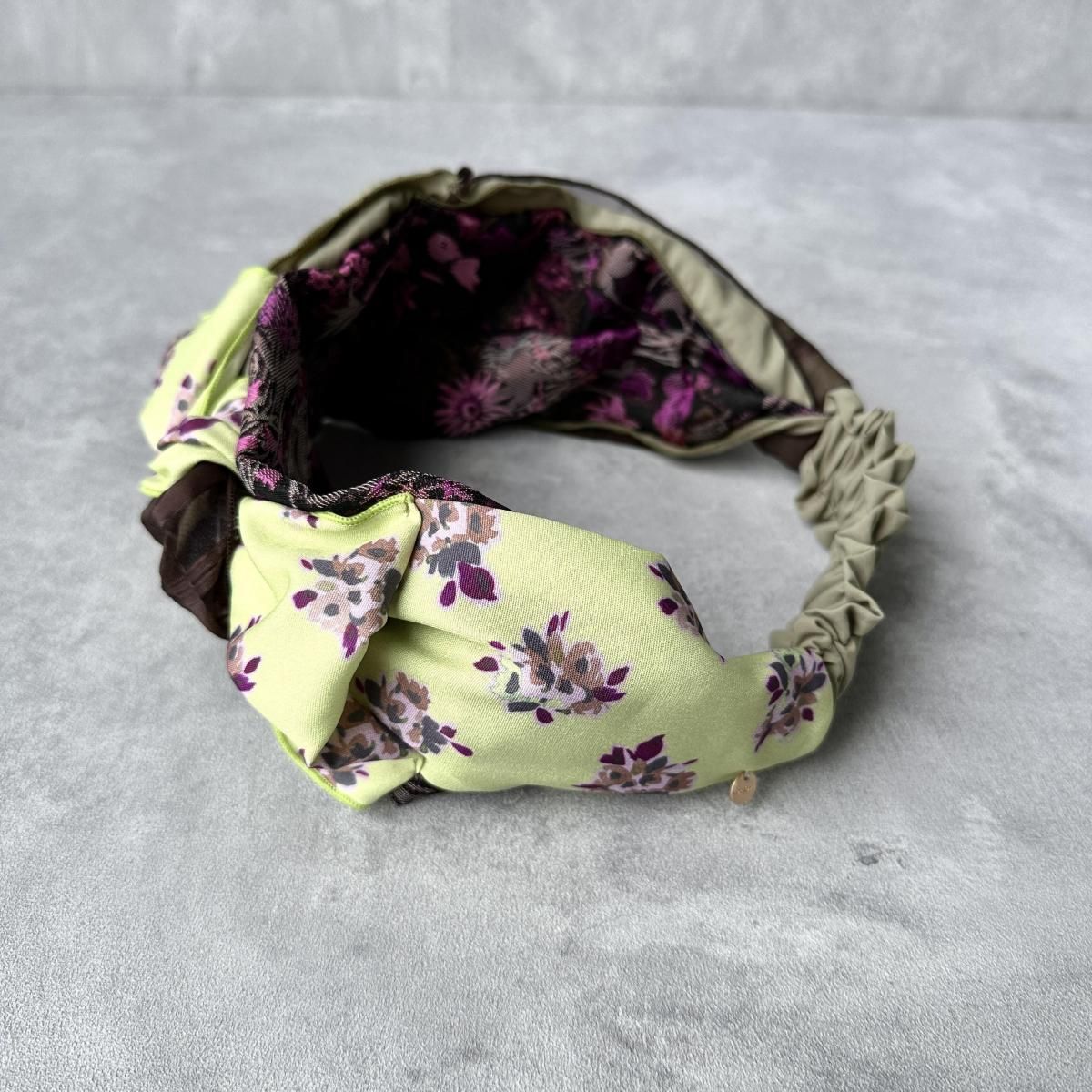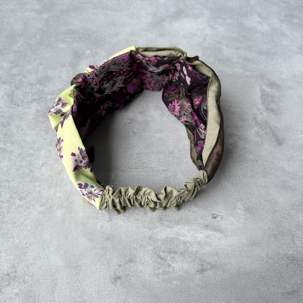 落ち着いたカーキとライラックフラワーが絶妙に調和した大人可愛いターバン。
