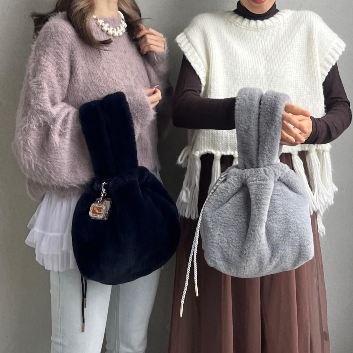 ウサギの耳のような、ふわふわの持ち手がついたファーバッグ。